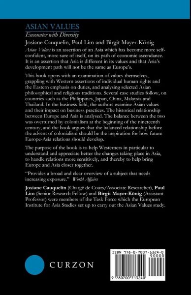 This book opens with an examination of values themselves, grappling with western assertions of individual human rights and the eastern emphasis on duties, and analysing selected Asian philosophical and religious traditions. Several case studies follow, on countries the Philippines, Japan, China, Malaysia and Thailand. The purpose of the book is to help westerners in particular to understand and appreciate better the changes taking place in Asia, to handle relations more sensitively, and thereby to help bring Europe and Asia together.