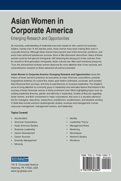 By necessity, understanding of leadership has been based on who used to be business leaders, namely men. In the last few years, Asian women have been making their mark in corporate America. Although Asian women have become part of the American workforce, and some have achieved spectacular success, there is little discussion about them. Many of these women could be first general immigrants, still balancing the strong pull of two cultures. Even for second or third generation immigrants, Asian cultures can often exert immense pressures. Thus, the achievement of these women deserves far more attention than it has received, and comprehensive research on these advances should be presented. Asian Women in Corporate America: Emerging Research and Opportunities traces the history of Asian women's presence as executives of major American corporations, presents biographical sketches of a select few, draws upon factors (individual, corporate, and societal) that influenced their journeys, and links to past theories on business leadership. The chapters serve to bring attention to a minority group in leadership and extricates factors that helped in the success of Asian American women in these prominent roles. While highlighting topics such as existing leadership theories, gender and ethnicity in leadership, models of theories regarding Asian women, and their involvement in major corporations, this book is a valuable reference tool for managers, executives, researchers, practitioners, academicians, and students working in fields that include women's studies/gender studies, business and management, human resources management, management science, and leadership.