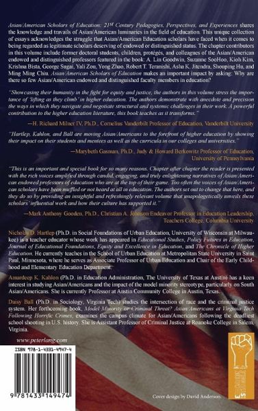 Asian/American Scholars of Education: 21st Century Pedagogies, Perspectives, and Experiences shares the knowledge and travails of Asian/American luminaries in the field of education. This unique collection of essays acknowledges the struggle that Asian/American Education scholars have faced when it comes to being regarded as legitimate scholars deserving of endowed or distinguished status. The chapter contributors in this volume include former doctoral students, children, protégés, and colleagues of the Asian/American endowed and distinguished professors featured in the book: A. Lin Goodwin, Suzanne SooHoo, Kioh Kim, Krishna Bista, George Sugai, Yali Zou, Yong Zhao, Robert Teranishi, Asha K. Jitendra, Shouping Hu, and Ming Ming Chiu. Asian/American Scholars of Education makes an important impact by asking: Why are there so few Asian/American endowed and distinguished faculty members in education?