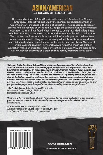 "Nicholas D. Hartlep, Daisy Ball, and Kevin E. Wells and their second edition of Asian/American Scholars of Education 21st Century Pedagogies, Perspectives, and Experiences place their field-shifting perspectives on the engagements of Asian American faculty in Academe who have received named professorships. Hartlep, Ball, and Wells stand on the shoulders of the giants in the field-Derald Wing Sue, Robert Teranishi, and Mitchell Chang among others-to gain an aerial view of the higher education landscape that has been at best sparsely occupied, and at worst bereft of literature that speaks to the Asian American experience. Their tome unapologetically provides intellectual space to problematize pedagogical approaches, as well as experiential and perspectival engagements through the narratives shared by these named professors."-Dr. Fred A. Bonner II, Professor and Endowed Chair, Whitlowe R. Green College of Education, Prairie View A&M University