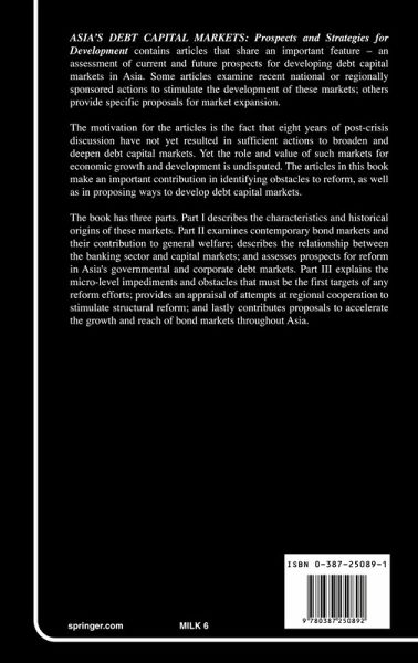 Asia's Debt Capital Markets: Opportunities and Prospects.- Opportunities and Challenges in Asian Bond Markets.- Developing Asian Bond Markets Using Securitization and Credit Guarantees.- Contemporary Markets for Asian Debt Capital Market Instruments.- The Role of Reform.- Institutional Reform and Economic Development.- Reforming China's Bond Markets: Development prospects and the effects of corporate behavior.- Improving the Policy Environment for Private Sector Participation in the Development of Local Currency and Regional Bond Markets in APEC: Report of a financial sector survey.- Strategies for Development.- Essential Changes in National Law and Regulation: Impediments to cross-border investment in Asian bond markets.- Policy Concerns and the Value of Regional Markets.- Promoting Market Development with Structured Finance and Regional Credit Enhancement.- Building a Settlement Infrastructure for the Asian Bond Markets: Asiasettle.