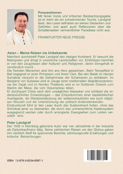 PressestimmenMit feiner Ironie und kritischer Beobachtungsgabe ist er mehr als ein schwärmender Tourist. Landgraf lässt den Leser teilhaben an seinen Gedanken und Gefühlen und spart auch Reflexionen über die kleinen Schattenseiten vermeintlicher Paradiese nicht aus.FRANKFURTER NEUE PRESSEAsien - Meine Reisen ins UnbekannteMehrfach durchstreift Peter Landgraf den riesigen Kontinent, besucht die Metropolen und dringt in abgeschiedene Landschaften vor. Er berichtet von den Zeugnissen alter Kulturen und Religionen, und macht deren Sinngehalt verständlich. Die fremden Menschen sind ihm ans Herz gewachsen. Er schildert seine Begegnungen beim Tempelfest in Bali, bei den Schamanen in Sumatra, bei einer Begräbniszeremonie in Sulawesi und den Opiumbauern in Nordthailand.China durchquert er nach dem unsäglichen Massaker. Unverblümt schildert er die Widersprüche: Freiheit in der Wirtschaft und bei der Wiederentdeckung weltanschaulicher wie religiöser Wurzeln, aber Unterdrückung politisch Andersdenkender.Eindrucksvoll führt er durch den Subkontinent Indien, ohne das Schicksal der durch das Kastensystem Ausgegrenzten und durch Zwangsheirat zum Leiden Verdammten zu übersehen.