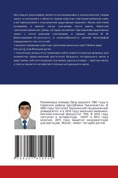 Nastoqschaq monografiq qwlqetsq issledowaniem w analiticheskoj teorii chisel, otnosqschimsq k oblasti teorii korotkih trigonometricheskih summ, i eö prilozheniqm k klassicheskim additiwnym zadacham s bolee zhöstkimi uslowiqmi, a imenno, kogda slagaemye pochti rawny. Korotkie trigonometricheskie summy, kotorye woznikaüt pri reshenii additiwnyh zadach s pochti rawnymi slagaemymi, w perwye izuchena I. M. Vinogradowym. Aktual'nost' i celesoobraznost' dannoj monografii opredelqütsq tem, chto w nej ¿ izucheno powedenie korotkih trigonometricheskih summ G.Vejlq wida T(¿,x,y)=¿_(x-yw bol'shih dugah; ¿ poluchennye rezul'taty pozwolili najti asimptoticheskuü formulu dlq kolichestwa predstawlenij dostatochno bol'shogo natural'nogo chisla w wide summy tröh pochti rawnyh slagaemyh, dwa iz kotoryh - prostye chisla, a tret'e qwlqetsq chetwörtoj stepen'ü natural'nogo chisla.