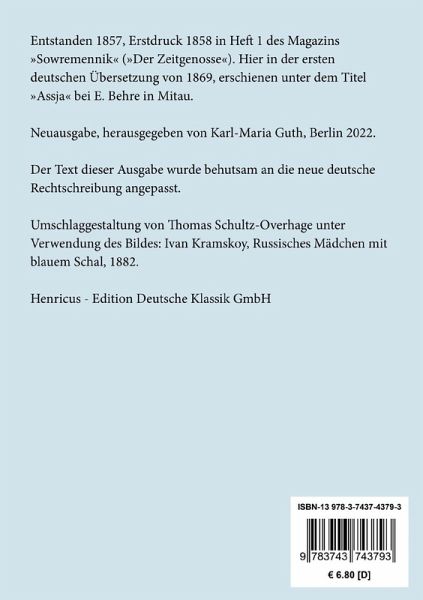 Iwan Turgenjew: Asja. Eine Liebe am MittelrheinEntstanden 1857, Erstdruck 1858 in Heft 1 des Magazins »Sowremennik« (»Der Zeitgenosse«). Hier in der ersten deutschen Übersetzung von 1869, erschienen unter dem Titel »Assja« bei E. Behre in Mitau.Neuausgabe, herausgegeben von Karl-Maria Guth, Berlin 2023.Der Text dieser Ausgabe wurde behutsam an die neue deutsche Rechtschreibung angepasst.Umschlagabbildung: Ivan Kramskoy, Russisches Mädchen mit blauem Schal, 1882Gesetzt aus der Minion Pro, 11 pt.Die Sammlung Hofenberg erscheint im Verlag Henricus - Edition Deutsche Klassik GmbH, BerlinÜber den Autor:1818 in Orjol, etwa 350 km südwestlich von Moskau, in eine sehr wohlhabende Adelsfamilie hineingeboren, studiert Iwan Sergejewitsch Turgenew Literatur in Moskau und St. Petersburg bevor er ab 1838 ausgedehnte Studienreisen durch Westeuropa unternimmt. Zu dieser Zeit erscheinen seine ersten Gedichte im Druck. 1841 kehrt er zurück nach Russland, übernimmt kurzfristig eine Stellung als Beamter in St. Petersburg und kehrt schließlich auf das Gut seiner Familie zurück. Der lyrische Grundton seiner Novellen verhilft ihm rasch zu einem hohen Bekanntheitsgrad, seine liberale Weltanschauung hingegen führt ihn zwischenzeitlich in die Verbannung. Nachdem er die Leibeigenen seines Gutes freigegeben hat, verlässt er 1855 Russland dauerhaft und lebt in Deutschland, überwiegend in Baden-Baden, und Frankreich als aktives Mitglied des literarischen Jet Sets seiner Zeit. Neben seiner literarischen Begabung ist Turgenew ein brillanter Schachspieler und Turnierausrichter. Mit Iwan Sergejewitsch Turgenew stirbt am 3. September 1883 in der Nähe von Paris einer der bedeutendsten Vertreter des russischen Realismus an einem Krebsleiden.