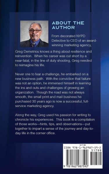 From decorated NYPD Detective to CEO of an award-winning marketing agency, Greg Demetriou knows a thing about resilience and reinvention. When his career was cut short by a near-fatal, in the line of duty shooting, Greg needed to reimagine his life. Never one to fear a challenge, he embarked on a new business path. With the conviction that failure was not an option, he immersed himself in learning the ins and outs and challenges of growing an organization. Though the road was not always smooth, the small print and mail business he purchased 30 years ago is now a successful, full-service marketing agency. Along the way, Greg used his passion for writing to chronicle his experiences. This book is a compilation of those works-hints, tips, and observations-put together to impart a sense of the journey and day-to-day life in the corner office.