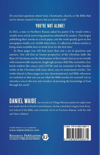 Do you have questions about God, Christianity, church, or the Bible that you've always wanted to know, but are afraid to ask? You're not alone! In 2021, a man in Northern Kansas asked his pastor if he would write a weekly news article answering questions submitted by readers. They began publishing their articles to a local paper, and the work quickly grew to five newspapers totally over 10,000 subscribers. A collection of these articles is being made available here in book form for the first time. In these pages you will find more than just a set of questions and answers. You will find an honest perspective of the Christian faith: the flaws of Christians and the flawlessness of the Gospel. Join us as we wrestle with unanswerable mysteries, laughingly pursue child-like curiosities, face harsh realities like cancer and COVID, and are reminded of the timeless truths of the Christian faith from short, easy-to-understand articles. The truths shared in these pages are non-denominational, and Bible references are included so that you can see what the Bible teaches for yourself. Let us introduce you to the joys and wonders of pursuing the knowledge of God through his word!