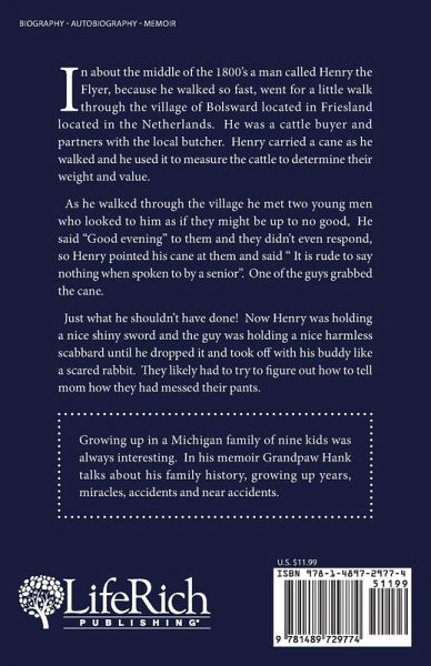 Growing up in a Michigan family of nine kids was always interesting. In his memoir Grandpaw Hank talks about his family history, growing up years, miracles, accidents and near accidents.