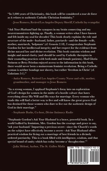 There is, perhaps, no more controversial statement today than "the husband is the boss of his wife." In Ask Your Husband, Mrs. Timothy J. Gordon explains how this proposition proves to be required by Scripture and by two millennia of Catholic teaching. Ask Your Husband instructs Catholic wives how properly to serve their husbands in Christian marriage: by emulating our Lady and by embracing the household patriarchy, just as she did. Ask Your Husband is a counter-cultural manifesto of the domicile. Against the fetid rot of feminism, Christian wives should employ this book in their labors to rehabilitate the wayward popular Christian view of their sexual roles, their souls, their marriages, and their mothering.
