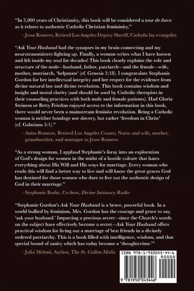 There is, perhaps, no more controversial statement today than "the husband is the boss of his wife." In Ask Your Husband, Mrs. Timothy J. Gordon explains how this proposition proves to be required by Scripture and by two millennia of Catholic teaching. Ask Your Husband instructs Catholic wives how properly to serve their husbands in Christian marriage: by emulating our Lady and by embracing the household patriarchy, just as she did. Ask Your Husband is a counter-cultural manifesto of the domicile. Against the fetid rot of feminism, Christian wives should employ this book in their labors to rehabilitate the wayward popular Christian view of their sexual roles, their souls, their marriages, and their mothering.