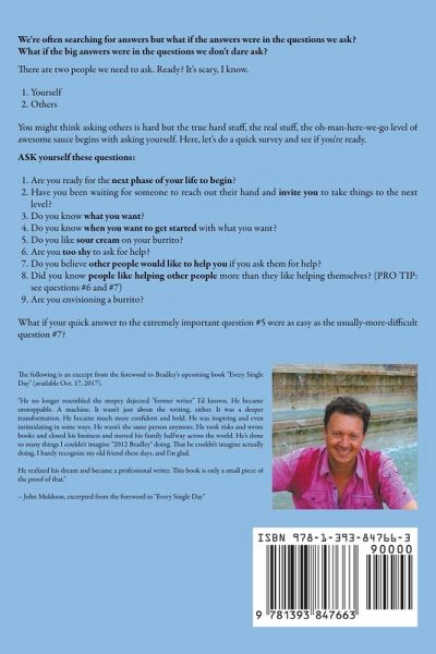 We're often searching for answers but what if the answers were in the questions we ask? What if the big answers were in the questions we don't dare ask? There are two people we need to ask. Ready? It's scary, I know. 1. Yourself 2. Others You might think asking others is hard but the true hard stuff, the real stuff, the oh-man-here-we-go level of awesome sauce begins with asking yourself. Here, let's do a quick survey and see if you're ready. ASK yourself these questions: 1. Are you ready for the next phase of your life to begin? 2. Have you been waiting for someone to reach out their hand and invite you to take things to the next level? 3. Do you know what you want? 4. Do you know when you want to get started with what you want? 5. Do you like sour cream on your burrito? 6. Are you too shy to ask for help? 7. Do you believe other people would like to help you if you ask them for help? 8. Did you know people like helping other people more than they like helping themselves? (PRO TIP: see questions #6 and #7) 9. Are you envisioning a burrito? What if your quick answer to the extremely important question #5 were as easy as the usually-more-difficult question #7? What if you could get more comfortable asking yourself the big questions? What if you could practice asking others for help and you got to the point where they starting asking you if they could help you? In this book, you'll discover: * How to ask for help without begging--and even turning around the tables so people get in line to help you * Why you first might just maybe want to ask yourself what your focus is at this point in your life * When to not ask anyone but yourself the question you most want the answer to * What to ask yourself each and every morning and evening * How to dig deep into your subconscious mind to get around that pesky conscious self Get ASK today to answer the question of, "What do I do next?" ASK is book 3 in the Repossible Series and a vital step before moving along the roadmap. 1. Repossible: An introductory guide to the question, "Who will you be next?" 2. Every Single Day: a clear roadmap towards lasting transformation in you 3. Ask: if life is a multiple choice quiz, this is the answer 4. Dare: challenge yourself to truly answer the questions and rocket forward 5. Create: you're ready to get real about achieving your dream, here's what to do 6. Decide: there's a fork in the road, you'll now know what do to 7. Meditate: this is the source of our creativity, power, and direction 8. Spark: there's only one thing better than creating: helping someone else create 9. Surrender: you've done your part, it's time to be invited to the big stage 10. Play: we're through the woods, it's time to exhale, smile, and play the game 11. Celebrate: compare your own today to your own yesterday and revel in the progress 12. Evaluate: measure how far you've come, forecast how far you'll go 13. Elevate: now that we're at the top of the mountain, it's time to scale up 14. Elevate: Now we're going to take everything to the next level