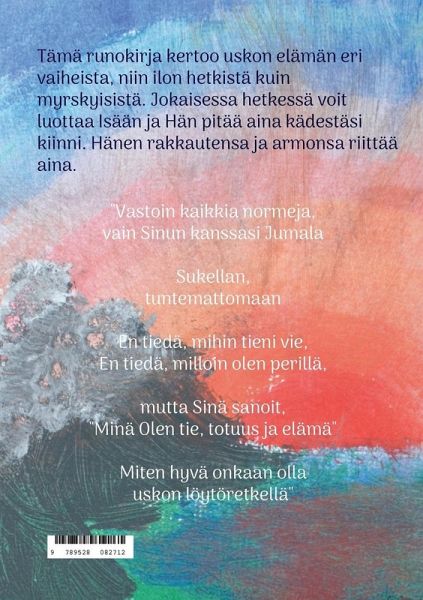 Tämä runokirja kertoo uskon elämän eri vaiheista, niin ilon hetkistä kuin myrskyisistä. Jokaisessa hetkessä voit luotaa Isään ja Hän pitää aina kädestäsi kiinni. Hänen rakkautensa ja armonsa riittää. Voit aina luottaa Häneen. "Vastoin kaikkia normeja, vain Sinun kanssasi Jumala Sukellan, tuntemattomaan En tiedä, mihin tieni vie, En tiedä, milloin olen perillä, mutta Sinä sanoit, "Minä Olen tie, totuus ja elämä" Miten hyvä onkaan olla uskon löytöretkellä"