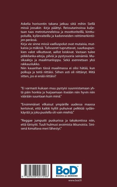 Askelia horisontin takana jatkuu siitä mihin Siellä missä jossakin -kirja päättyi. Reissutarinoissa kuljetaan taas metrotunneleissa ja moottoriteillä, kinttupoluilla, kylänraiteilla sekä kadonneiden reittimerkintöjen perässä. Kirja vie sinne missä vaelluspolut ovat mutaisia, mutkaisia ja mäkisiä. Tulivuoret tupruttavat, suurkaupunkien valot vilkuttavat, aallot loiskivat. Vastaan tulee piikkilanka-aitoja, pilviä ja pystysuoria seinämiä. Musikaaleja ja maailmanloppu. Sekä asennetaan yksi rakkauslukko. Niin kauanhan tässä maailmassa ei olisi hätää, kun polkuja ja teitä riittäisi. Siihen asti oli riittänyt. Mitä sitten, jos ei enää riittäisi? "Ei varmasti kukaan muu pystyisi suunnistamaan yhtä päin honkia ja huijaamaan itseään niin hyvin niin väärään suuntaan kuin minä." "Ensimmäiset vilkaisut ympärille uudessa maassa kertoivat, että kaikki kyltit puhuivat pelkkää sydänkäyrää ja joka puolella oli vain miehiä." "Reggae jumputti puskurissa ja takakontissa niin, että tärisytti. Tuuli hulmusi avoimista ikkunoista. Sinisenä kimaltava meri lähestyi."