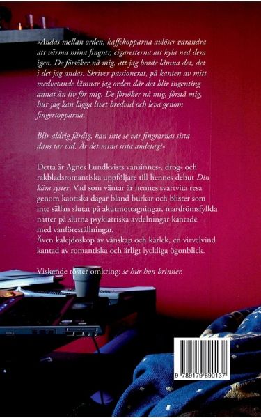 »Andas mellan orden, kaffekopparna avlöser varandra att värma mina fingrar, cigaretterna att kyla ned dem igen. De försöker nå mig, att jag borde lämna det, det i det jag andas. Skriver passionerat, på kanten av mitt medvetande lämnar jag orden där det blir ingenting annat än liv för mig. De försöker nå mig, förstå mig, hur jag kan lägga livet bredvid och leva genom fingertopparna. Blir aldrig färdig, kan inte se var fingrarnas sista dans tar vid. Är det mina sista andetag? « Detta är Agnes Lundkvists vansinnes- drog- och rakbladsromantiska uppföljare till hennes debut Din kära syster. Vad som väntar är hennes svartvita resa genom kaotiska dagar bland burkar och blister som inte sällan slutat på akutmottagningar, mardrömsfyllda nätter på slutna psykiatriska avdelningar kantade med vanföreställningar. Även kaljedoskop av vänskap och kärlek, en virvelvind kantad av romantiska och ärligt lyckliga ögonblick. Viskande röster omkring: se hur hon brinner.
