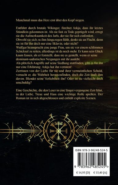 Manchmal muss das Herz erst über den Kopf siegen. Entführt durch brutale Wikinger, fürchtet Askja, dass ihr letztes Stündlein gekommen ist. Als sie fast zu Tode geprügelt wird, erregt sie die Aufmerksamkeit des Jarls, der sie für sich einfordert.Obwohl sie sich zu ihm hingezogen fühlt, denkt sie an Flucht, denn sie ist für ihn doch nur eine Sklavin, oder nicht?Wulfgar beansprucht eine junge Frau, um sie vor einem schlimmen Schicksal zu retten, allerdings ist da noch mehr. Er kann sein Glück kaum fassen, als er feststellt, dass sie es genießt, wenn er seine dominant-sadistischen Neigungen mit ihr auslebt.Als plötzlich Angriffe auf seine Siedlung stattfinden, gibt es für ihn nur eine Erklärung: Askja hat ihn verraten!Zerrissen von der Liebe für sie und ihrer vermeintlichen Schuld, versucht er, die Wahrheit herauszufinden, doch die Zeit läuft ihm davon. Ist sie vielleicht doch unschuldig? Oder blendet seine Verliebtheit ihn?Eine Geschichte, die den Leser in eine längst vergangene Zeit führt, in der Liebe, Treue und Hass eine wichtige Rolle spielten. Der Roman ist in sich abgeschlossen und enthält explizite Szenen.