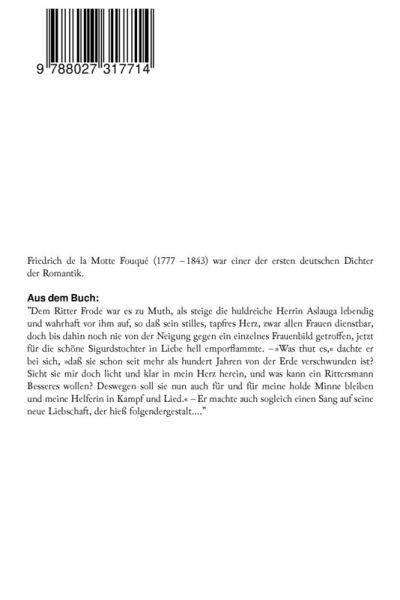Friedrich de la Motte Fouqué (1777 - 1843) war einer der ersten deutschen Dichter der Romantik. Aus dem Buch: "Dem Ritter Frode war es zu Muth, als steige die huldreiche Herrin Aslauga lebendig und wahrhaft vor ihm auf, so daß sein stilles, tapfres Herz, zwar allen Frauen dienstbar, doch bis dahin noch nie von der Neigung gegen ein einzelnes Frauenbild getroffen, jetzt für die schöne Sigurdstochter in Liebe hell emporflammte. - Was thut es, dachte er bei sich, daß sie schon seit mehr als hundert Jahren von der Erde verschwunden ist? Sieht sie mir doch licht und klar in mein Herz herein, und was kann ein Rittersmann Besseres wollen? Deswegen soll sie nun auch für und für meine holde Minne bleiben und meine Helferin in Kampf und Lied. - Er machte auch sogleich einen Sang auf seine neue Liebschaft, der hieß folgendergestalt...."