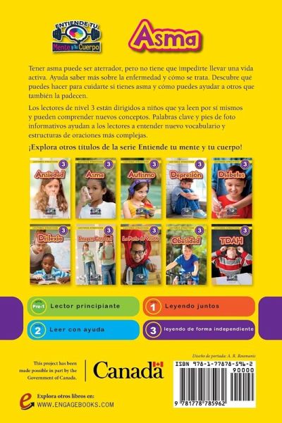 Tener asma puede ser aterrador, pero no tiene que impedirte llevar una vida activa. Ayuda saber más sobre la enfermedad y cómo se trata. Descubre qué puedes hacer para cuidarte si tienes asma y cómo puedes ayudar a otros que también la padecen. Los lectores de nivel 3 están dirigidos a niños que ya leen por sí mismos y pueden comprender nuevos conceptos. Palabras clave y pies de foto informativos ayudan a los lectores a entender nuevo vocabulario y estructuras de oraciones más complejas. Este proyecto ha sido posible en parte gracias al Gobierno de Canadá.