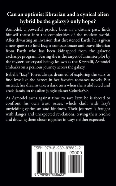 Can an optimist librarian and a cynical alien hybrid be the galaxy's only hope? Asmodel, a powerful psychic born in a distant past, finds himself thrust into the complexities of the modern world. After thwarting an invasion that threatened Earth, he is given a new quest: to find Izzy, a compassionate and brave librarian from Earth who has been kidnapped from the galactic exchange program. Fearing she is the target of a sinister plot by the mysterious crystal beings known as the Krystalii, Asmodel embarks on a perilous journey across the galaxy. Isabella "Izzy" Torres always dreamed of exploring the stars to find love like the heroes in her favorite romance novels. When she's offered the chance to go into space and meet an alien soul-mate, she jumps at it, leaving everything behind. But her dreams take a dark turn when she is abducted and crash-lands on the alien jungle planet CeluriaVO. Here, she finds herself amidst a civil war between intelligent panther-like humanoids, the Scikvak, who are on the brink of genocide. The leading faction of Scikvak's are in league with the inter-dimensional Krystalii, who demand Izzy be handed over for their own nefarious purposes. As Asmodel races against time to save Izzy, he is forced to confront his own trust issues, which clash with Izzy's unyielding optimism and kindness. Their journey is fraught with danger and unexpected revelations, testing their resolve and drawing them closer together in ways neither expected. Which leaves two profoundly different souls a choice. Be brave enough to conquer their inner demons to trust not only each other, but dare to trust themselves as well?
