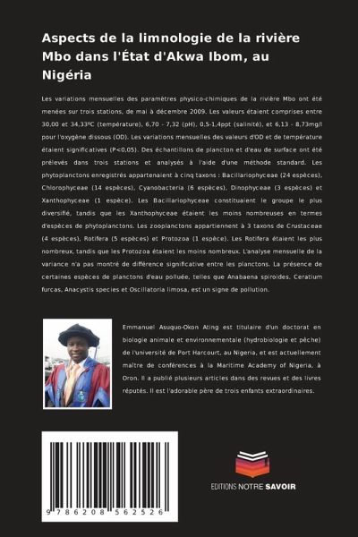 Les variations mensuelles des paramètres physico-chimiques de la rivière Mbo ont été menées sur trois stations, de mai à décembre 2009. Les valeurs étaient comprises entre 30,00 et 34,33ºC (température), 6,70 - 7,32 (pH), 0,5-1,4ppt (salinité), et 6,13 - 8,73mg/l pour l'oxygène dissous (OD). Les variations mensuelles des valeurs d'OD et de température étaient significatives (P<0,05). Des échantillons de plancton et d'eau de surface ont été prélevés dans trois stations et analysés à l'aide d'une méthode standard. Les phytoplanctons enregistrés appartenaient à cinq taxons : Bacillariophyceae (24 espèces), Chlorophyceae (14 espèces), Cyanobacteria (6 espèces), Dinophyceae (3 espèces) et Xanthophyceae (1 espèce). Les Bacillariophyceae constituaient le groupe le plus diversifié, tandis que les Xanthophyceae étaient les moins nombreuses en termes d'espèces de phytoplanctons. Les zooplanctons appartiennent à 3 taxons de Crustaceae (4 espèces), Rotifera (5 espèces) et Protozoa (1 espèce). Les Rotifera étaient les plus nombreux, tandis que les Protozoa étaient les moins nombreux. L'analyse mensuelle de la variance n'a pas montré de différence significative entre les planctons. La présence de certaines espèces de planctons d'eau polluée, telles que Anabaena spiroides, Ceratium furcas, Anacystis species et Oscillatoria limosa, est un signe de pollution.