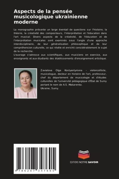 La monographie présente un large éventail de questions sur l'histoire, la théorie, la créativité des compositeurs, l'interprétation et l'éducation dans l'art musical. Divers aspects de la créativité, de l'éducation et de l'interprétation musicales sont examinés sous l'angle d'une approche interdisciplinaire, de leur généralisation philosophique et de leur compréhension culturelle, ce qui révèle et enrichit considérablement le sujet de la recherche.L'ouvrage s'adresse aux scientifiques, aux musiciens en exercice, aux enseignants et aux étudiants des établissements d'enseignement artistique.