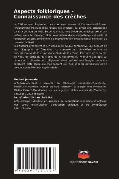 Le folklore avec l'entretien des coutumes locales et l'interculturalité avec l'inculturation s'occupent de l'étude des crèches, qui prend une signification dans la période de Noël. En complément, une étude des crèches prend son intérêt dans le maintien et la valorisation d'une compétence culturelle et religieuse en tant qu'élément de représentation d'événements bibliques au moment de Noël. Les auteurs présentent le lien dans cette double perspective, qui découle de leur biographie de formation. Le contexte est considéré comme un enrichissement de la vision d'une étude de la crèche. L'histoire de la crèche de Noël, les concepts de crèche et les coutumes du Tyrol sont abordés. La dimension culturelle et religieuse ainsi qu'une muséologie populaire concluent cette étude qui met l'accent sur des aspects personnels et se penche sur la littérature spécialisée.
