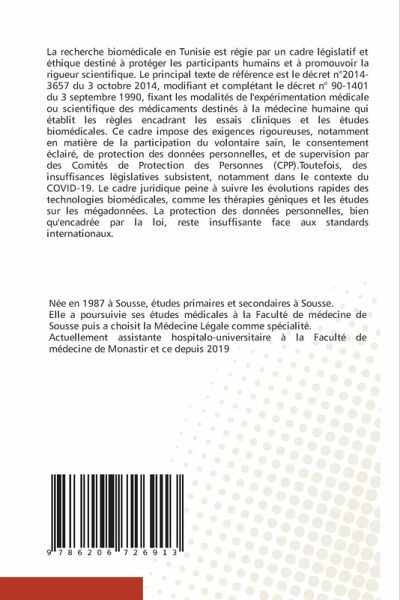 La recherche biomédicale en Tunisie est régie par un cadre législatif et éthique destiné à protéger les participants humains et à promouvoir la rigueur scientifique. Le principal texte de référence est le décret n°2014-3657 du 3 octobre 2014, modifiant et complétant le décret n° 90-1401 du 3 septembre 1990, fixant les modalités de l'expérimentation médicale ou scientifique des médicaments destinés à la médecine humaine qui établit les règles encadrant les essais cliniques et les études biomédicales. Ce cadre impose des exigences rigoureuses, notamment en matière de la participation du volontaire sain, le consentement éclairé, de protection des données personnelles, et de supervision par des Comités de Protection des Personnes (CPP).Toutefois, des insuffisances législatives subsistent, notamment dans le contexte du COVID-19. Le cadre juridique peine à suivre les évolutions rapides des technologies biomédicales, comme les thérapies géniques et les études sur les mégadonnées. La protection des données personnelles, bien qu'encadrée par la loi, reste insuffisante face aux standards internationaux.