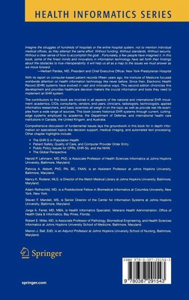 Divided into four important sections--Needs, Current State, Technology, and Going Forward--the book provides the background and general notions regarding the EHRS and lays out the framework; delves into the historical review; presents a high-level view of EHR systems, focused on the needs of different stakeholders in the health care and the health enterprise; offers practical views of existing systems and current (and short-term future) issues in specifying a EHR system and deciding how to approach the institution of such a system; deals with technology issues, from front- to back-end; and describes where we are and where we should be going with EHR systems.