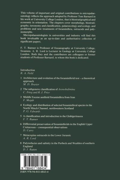 This volume is a collection of papers presented to Professor Tom Barnard by former students, colleagues and friends to mark thirty-two years of teaching and research in micropalaeontology at University College London. This period represents the major part of Tom Barnard's career with microfossils, which actually began rather earlier, but in 1949 his first postgraduate students were registered. Since then some 150 students have worked for higher degrees studying foraminifera, ostracods, calcareous nannofossils, dino of Research flagellates and palynomorphs, in company with a series Assistants and Visiting Scientists. The nature of micropalaeontology at 'UC' under Tom Barnard has always been unashamedly biostratigraphical. As a result many students have entered and continue to enter the petroleum industry, not least of all because their mentor has always had a pragmatic view of academic research and its direction. Despite this emphasis, with a particular attention to Mesozoic foraminifera, a major investigation of Recent Caribbean foraminiferal faunas has been carried out and most recently MSc classes have worked with material from the continental shelf of southern Africa. Work with Mesozoic ostracods was initiated in 1956 and during the past decade a growing number of students have concentrated on calcareous nannofossils. A book sum marising the results of biostratigraphical work with nannofossils is at present in the press (Lord, A. R. (ed. ) A stratigraphical index of calcareous nanno fossils. Chichester: Ellis Horwood).