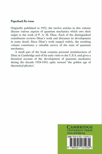 Originally published in 1972, the twelve articles in this volume discuss various aspects of quantum mechanics that owe their origin to the work of P. A. M. Dirac. Each of the distinguished contributors reviews Dirac's work and discusses its development in some detail. Since Dirac's work ranged widely, the resulting volume constitutes a valuable survey of the state of quantum mechanics. A small part of the book contains personal reminiscences of Dirac in Cambridge and of his early visits to the USA and gives a historical account of the development of quantum mechanics during the decade 1924-1933, aptly termed 'the golden age of theoretical physics'.