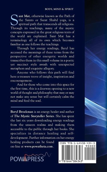 Sant Mat, otherwise known as the Path of the Saints or Surat Shabd yoga, is a spiritual path that transcends all religions. Through its teachings, many of the mystic concepts expressed in the great religious texts of the world are explained. Sant Mat has a terminology all of its own which becomes familiar as one follows the teachings. Through her energy readings, Beryl has accessed the meanings of these terms from the perspective of other energetic worlds and transcribes them in this small volume in a poetic yet succinct style awash with unexpected metaphors and exquisite allegory. For those initiated into Sant Mat, the most important task is to sit daily in meditation in order to reach god-realization. Anyone attempting this goal will know how difficult it is to discipline oneself to take the time for meditation in a world wildly demanding our attention at every turn. We are distracted constantly to do everything but sit. Any device, in media or print, which can help us subdue the worries in our mind and inspire us to meditate is invaluable. This beautiful book entreats us to remember God and the Master, and pulls us towards the knowledge that meditation is our most important task. It is hoped that by reading it, followers of this path will be inspired to sit for the allotted time without having to struggle so much against the dictates of their minds. Anyone who follows this path will find here a treasure trove of insight, inspiration and encouragement. And for those who come into this space for the first time, this is a doorway opening to a new world of thought and philosophy that may or may not make any sense but will certainly calm the mind and feed the soul.