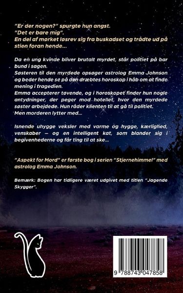 "Er der nogen?" spurgte hun angst. "Det er bare mig." En del af mørket løsrev sig fra bukskadset og trådte ud på stien foran hende ... Da en ung kvinde bliver brutalt myrdet, står politiet på bar bund i sagen. Søsteren til den myrdede opsøger astrolog Emma Johnson og beder hende se på den dræbtes horoskop i håb om at finde mening i tragedien. Emma accepterer tøvende, og i horoskopet finder hun nogle antydninger, der peger mod hotellet, hvor den myrdede søster arbejdede. Hun råder klienten til at gå til politiet. Men morderen lytter med ... Isnende uhygge veksler med varme og hygge, kærlighed, venskaber - og en intelligent kat, som blander sig i begivenhederne og får ting til at ske ... "Aspekt for Mord" er første bog i serien "Stjernehimmel" med astrolog Emma Johnson. Bemærk: Bogen har tidligere været udgivet med titlen "Jagende Skygger".