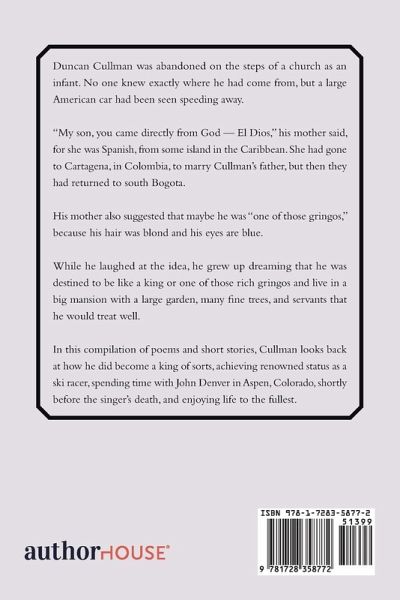 Duncan Cullman was abandoned on the steps of a church as an infant. No one knew exactly where he had come from, but a large American car had been seen speeding away. "My son, you came directly from God - El Dios," his mother said, for she was Spanish, from some island in the Caribbean. She had gone to Cartagena, in Colombia, to marry Cullman's father, but then they had returned to south Bogota. His mother also suggested that maybe he was "one of those gringos," because his hair was blond and his eyes are blue. While he laughed at the idea, he grew up dreaming that he was destined to be like a king or one of those rich gringos and live in a big mansion with a large garden, many fine trees, and servants that he would treat well. In this compilation of poems and short stories, Cullman looks back at how he did become a king of sorts, achieving renowned status as a ski racer, spending time with John Denver in Aspen, Colorado, shortly before the singer's death, and enjoying life to the fullest.