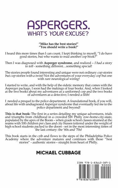 "Mike has the best stories!" "You should write a book!" I heard this more times than I can count. I kept thinking to myself, "I do have good stories, but who wants to read another cop book?" Then I was diagnosed with Asperger syndrome, and realized - I had a story to tell - something different...something special! The stories people found interesting and unique were not ordinary cop stories but cop stories with a twist! Not the adventures of your everyday cop but one with rare neurological wiring! I started to write, and with the help of the eidetic memory that comes with the Asperger package, I soon had the makings of four books. And, when I looked at the two books about my adventures as a uniformed cop and the two books of adventures as a detective; I needed a fifth! I needed a prequel to the police department. A foundational book, if you will, about life with undiagnosed Asperger syndrome that eventually led me to the police department and beyond! This is that book: The first in a series detailing my unique adventures, trials and triumphs from childhood in a crowded SW Philly row-home-city-state, populated by the apex of the Boom - when grade school classes strained at the seams with 100 children per class and city busses tottered under the weight of high school students packed to the doors - set in the most interesting times of the last century: the '60s and '70s! This book starts in the crib and flows to the steps of the Philadelphia Police Academy where the adventure matures and continues with those "best stories" - authentic stories - straight from heart of Philly.
