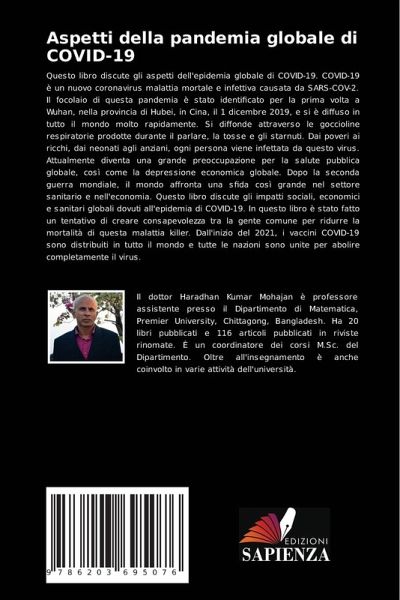 Questo libro discute gli aspetti dell'epidemia globale di COVID-19. COVID-19 è un nuovo coronavirus malattia mortale e infettiva causata da SARS-COV-2. Il focolaio di questa pandemia è stato identificato per la prima volta a Wuhan, nella provincia di Hubei, in Cina, il 1 dicembre 2019, e si è diffuso in tutto il mondo molto rapidamente. Si diffonde attraverso le goccioline respiratorie prodotte durante il parlare, la tosse e gli starnuti. Dai poveri ai ricchi, dai neonati agli anziani, ogni persona viene infettata da questo virus. Attualmente diventa una grande preoccupazione per la salute pubblica globale, così come la depressione economica globale. Dopo la seconda guerra mondiale, il mondo affronta una sfida così grande nel settore sanitario e nell'economia. Questo libro discute gli impatti sociali, economici e sanitari globali dovuti all'epidemia di COVID-19. In questo libro è stato fatto un tentativo di creare consapevolezza tra la gente comune per ridurre la mortalità di questa malattia killer. Dall'inizio del 2021, i vaccini COVID-19 sono distribuiti in tutto il mondo e tutte le nazioni sono unite per abolire completamente il virus.