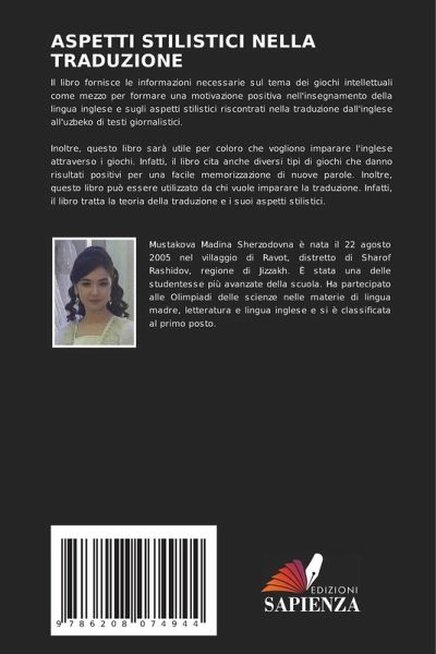 Il libro fornisce le informazioni necessarie sul tema dei giochi intellettuali come mezzo per formare una motivazione positiva nell'insegnamento della lingua inglese e sugli aspetti stilistici riscontrati nella traduzione dall'inglese all'uzbeko di testi giornalistici.Inoltre, questo libro sarà utile per coloro che vogliono imparare l'inglese attraverso i giochi. Infatti, il libro cita anche diversi tipi di giochi che danno risultati positivi per una facile memorizzazione di nuove parole. Inoltre, questo libro può essere utilizzato da chi vuole imparare la traduzione. Infatti, il libro tratta la teoria della traduzione e i suoi aspetti stilistici.