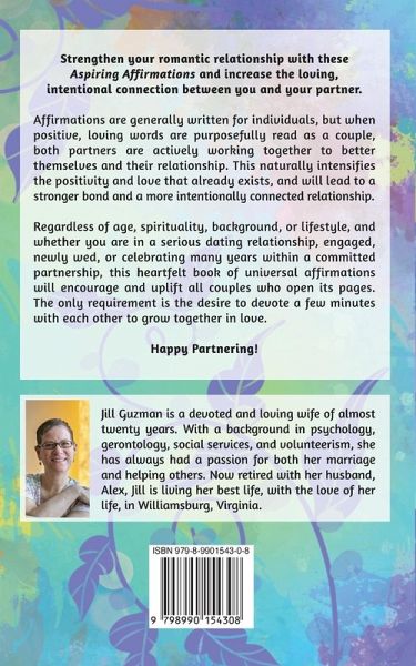 Strengthen your romantic relationship with these Aspiring Affirmations and increase the loving, intentional connection between you and your partner. Affirmations are generally written for individuals, but when positive, loving words are purposefully read as a couple, both partners are actively working together to better themselves and their relationship. This naturally intensifies the positivity and love that already exists, and will lead to a stronger bond and a more intentionally connected relationship. Regardless of age, spirituality, background, or lifestyle, and whether you are in a serious dating relationship, engaged, newly wed, or celebrating many years within a committed partnership, this heartfelt book of universal affirmations will encourage and uplift all couples who open its pages. The only requirement is the desire to devote a few minutes with each other to grow together in love. Happy Partnering!