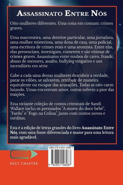 Oito mulheres diferentes. Uma coisa em comum: crimes graves. Uma marceneira, uma detetive particular, uma jornalista, uma mulher misteriosa, uma dona de casa, uma policial, uma escritora de crimes reais e uma aromista. Entre elas, elas presenciam, investigam, cometem e são vítimas de crimes graves. Assassinatos entre roubos de carro, fraude, abuso de menores, assalto, bullying vingativo e um incendiário em série. Cabe a cada uma dessas mulheres descobrir a verdade, parar os vilões, se salvarem, retribuir de maneira equivalente ou escapar das acusações. Todas as oito caem lutando. Umas encontram amor, outras sofrem a pior das traições. Essa viciante coleção de contos criminais de Sandi Wallace inclui os premiados "A morte do doce bebê", "Fardo" e "Fogo na Colina", junto com contos novos e inéditos. Esta é a grande edição impressa de Assassinato Entre Nós, com uma fonte / tipo de letra maior para facilitar a leitura.