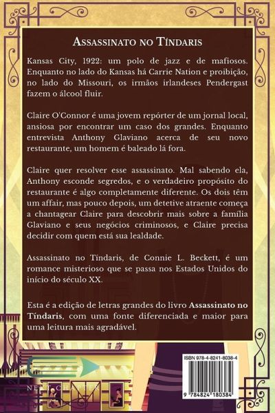 Kansas City, 1922: um polo de jazz e de mafiosos. Enquanto no lado do Kansas há Carrie Nation e proibição, no lado do Missouri, os irmãos irlandeses Pendergast fazem o álcool fluir. Claire O'Connor é uma jovem repórter de um jornal local, ansiosa por encontrar um caso dos grandes. Enquanto entrevista Anthony Glaviano acerca de seu novo restaurante, um homem é baleado lá fora. Claire quer resolver esse assassinato. Mal sabendo ela, Anthony esconde segredos, e o verdadeiro propósito do restaurante é algo completamente diferente. Os dois têm um affair, mas pouco depois, um detetive atraente começa a chantagear Claire para descobrir mais sobre a família Glaviano e seus negócios criminosos, e Claire precisa decidir com quem está sua lealdade. Assassinato no Tíndaris, de Connie L. Beckett, é um romance misterioso que se passa nos Estados Unidos do início do século XX. Esta é a edição de letras grandes do livro Assassinato no Tíndaris, com uma fonte diferenciada e maior para uma leitura mais agradável.