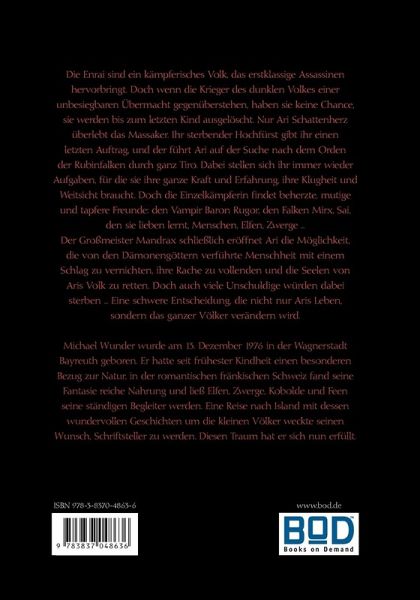 Die Enrai sind ein kämpferisches Volk, das erstklassige Assassinen hervorbringt. Doch wenn die Krieger des dunklen Volkes einer unbesiegbaren Übermacht gegenüberstehen, haben sie keine Chance, sie werden bis zum letzten Kind ausgelöscht. Nur Ari Schattenherz überlebt das Massaker. Ihr sterbender Hochfürst gibt ihr einen letzten Auftrag, und der führt Ari auf der Suche nach dem Orden der Rubinfalken durch ganz Tiro. Dabei stellen sich ihr immer wieder Aufgaben, für die sie ihre ganze Kraft und Erfahrung, ihre Klugheit und Weitsicht braucht. Doch die Einzelkämpferin findet beherzte, mutige und tapfere Freunde: den Vampir Baron Rugor, den Falken Mirx, Sai, den sie lieben lernt, Menschen, Elfen, Zwerge ... Der Großmeister Mandrax schließlich eröffnet Ari die Möglichkeit, die von den Dämonengöttern verführte Menschheit mit einem Schlag zu vernichten, ihre Rache zu vollenden und die Seelen von Aris Volk zu retten. Doch auch viele Unschuldige würden dabei sterben ... Eine schwere Entscheidung, die nicht nur Aris Leben, sondern das ganzer Völker verändern wird. Michael Wunder wurde am 13. Dezember 1976 in der Wagnerstadt Bayreuth geboren. Er hatte seit frühester Kindheit einen besonderen Bezug zur Natur, in der romantischen fränkischen Schweiz fand seine Fantasie reiche Nahrung und ließ Elfen, Zwerge, Kobolde und Feen seine ständigen Begleiter werden. Eine Reise nach Island mit dessen wundervollen Geschichten um die kleinen Völker weckte seinen Wunsch, Schriftsteller zu werden. Diesen Traum hat er sich nun erfüllt.