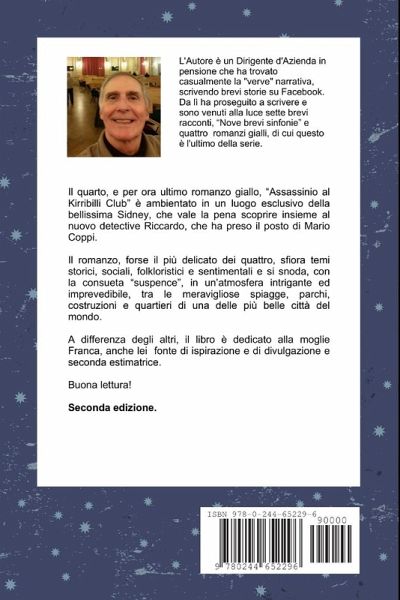 L'Autore è un Dirigente d'Azienda in pensione che ha trovato casualmente la "verve" narrativa, scrivendo brevi storie su Facebook. Da lì ha proseguito a scrivere e sono venuti alla luce sette brevi racconti, "Nove brevi sinfonie" e quattro romanzi gialli, di cui questo è l'ultimo della serie. Il quarto, e per ora ultimo romanzo giallo, "Assassinio al Kirribilli Club" è ambientato in un luogo esclusivo della bellissima Sidney, che vale la pena scoprire insieme al nuovo detective Riccardo, che ha preso il posto di Mario Coppi. Il romanzo, forse il più delicato dei quattro, sfiora temi storici, sociali, folkloristici e sentimentali e si snoda, con la consueta "suspence", in un'atmosfera intrigante ed imprevedibile, tra le meravigliose spiagge, parchi, costruzioni e quartieri di una delle più belle città del mondo. A differenza degli altri, il libro è dedicato alla moglie Franca, anche lei fonte di ispirazione e di divulgazione dopo la nipotina Sofia