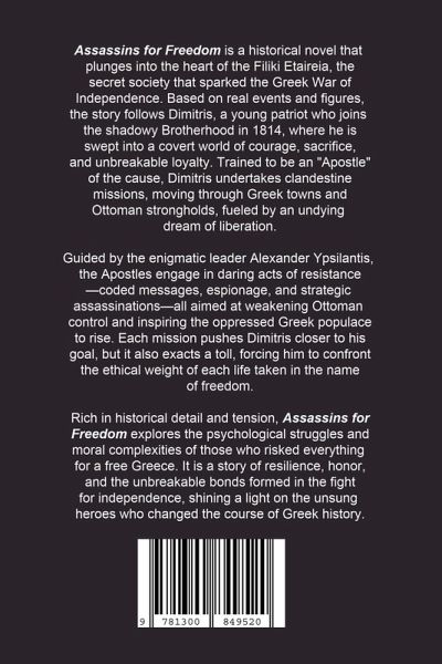 After 400 years of oppression, 20 men decided to take their country back. This is their remarkable story. Assassins for Freedom is a gripping historical novel set against the backdrop of the Greek War of Independence, weaving together fact and fiction to tell the story of the Filiki Etaireia, the secret society that fought to free Greece from Ottoman rule. Led by visionary Alexander Ypsilantis, the Filiki Etaireia-known as the Brotherhood-operated in the shadows, using assassination, coded messages, and daring missions to inspire a nation-wide uprising. At the heart of the story is Dimitris, a fictional young recruit whose journey reflects the spirit, sacrifice, and moral struggle of those who joined the Brotherhood. From his humble village beginnings to his initiation into the ranks of the Filiki Etaireia, Dimitris is trained as an "Apostle," a covert operative entrusted with the Brotherhood's most dangerous missions. Alongside real-life figures like Ypsilantis, Dimitris undertakes missions to eliminate key Ottoman officials, shatter the morale of local collaborators, and rally Greeks to the cause. The Brotherhood's operations are filled with tension and danger, each mission a test of courage and loyalty. As Dimitris delves deeper into the world of espionage and assassination, he finds himself haunted by the ethical toll of his actions. The question of whether freedom is worth every cost becomes central to his journey, as he balances duty to his homeland with personal moral dilemmas. Through Dimitris's eyes, the reader witnesses both the fierce devotion and inner conflicts of those who took up arms for a free Greece. Assassins for Freedom brings to life the atmosphere of 19th-century Greece under Ottoman oppression, portraying the tactical ingenuity and relentless resolve of the Brotherhood's operatives. Their struggle for liberation, filled with courage, sacrifice, and complex choices, echoes through the generations, shaping the spirit of Greece today. At once a thrilling adventure and a poignant reflection on patriotism, Assassins for Freedom honors the untold stories of the unsung heroes who risked everything for the dream of independence, capturing the resilience and hope that turned a movement into a revolution.