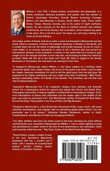 When former CIA assassin Adam Hunter's last hit goes awry, he attempts to leave behind his world of espionage and murder by embarking on a career in ministry. But soon, he is pulled back in to crack a code hidden in an ancient manuscript in order to foil a terrorist plot. In the meantime, Renie Ellis, a lawyer in the small town he's moved to gets caught up in his dilemma and falls in love with him, not realizing he killed her fiancé by accident. What will she do when she finds out who Adam really is? The heist of a famous Codex from the British Museum, Papal intrigue in the Vatican, both Sicilian and Russian Mafia, and a US President who knows more than she admits all play key roles in a story that keeps the reader guessing until the end, a conclusion that no one sees coming. From Rome to Jerusalem, from Egypt's Mt. Sinai to Tennessee's Smoky Mountains, the characters scramble for their lives, racing the clock to prevent an international disaster.