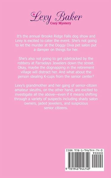 It's the annual Brooke Ridge Falls dog show and Lexy is excited to cater the event. She's not going to let the murder at the Doggy Diva pet salon put a damper on things for her. She's also not going to get sidetracked by the robbery at Farradays Jewelers down the street. Okay, maybe the dog napping in the retirement village will distract her. And what about the person stealing K-cups from the senior center? Lexy's grandmother and her gang of senior-citizen amateur sleuths, on the other hand, are excited to investigate all the above even if it means shifting through a variety of suspects including shady salon owners, jaded jewelrs and suspicious senior citizens.
