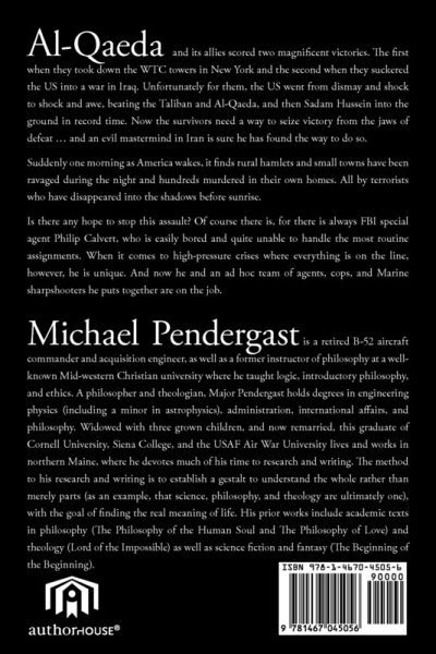 Al-Qaeda and its allies scored two magnificent victories. The first when they took down the WTC towers in New York and the second when they suckered the US into a war in Iraq. Unfortunately for them, the US went from dismay and shock to shock and awe, beating the Taliban and Al-Qaeda, and then Sadam Hussein into the ground in record time. Now the survivors need a way to seize victory from the jaws of defeat ... and an evil mastermind in Iran is sure he has found the way to do so. Suddenly one morning as America wakes, it finds rural hamlets and small towns have been ravaged during the night and hundreds murdered in their own homes. All by terrorists who have disappeared into the shadows before sunrise. Is there any hope to stop this assault? Of course there is, for there is always FBI special agent Philip Calvert, who is easily bored and quite unable to handle the most routine assignments. When it comes to high-pressure crises where everything is on the line, however, he is unique. And now he and an ad hoc team of agents, cops, and Marine sharpshooters he puts together are on the job.