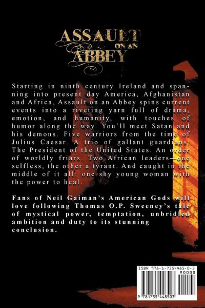 Starting in ninth century Ireland and spanning into present day America, Afghanistan and Africa, Assault on an Abbey spins current events into a riveting yarn full of drama, emotion, and humanity, with touches of humor along the way. You'll meet Satan and his demons. Five warriors from the time of Julius Caesar. A trio of gallant guardians. The President of the United States. An order of worldly friars. Two African leaders-one selfless, the other a tyrant. And caught in the middle of it all: one shy young woman with the power to heal. Fans of Neil Gaiman's American Gods will love following Thomas O.P. Sweeney's tale of mystical power, temptation, unbridled ambition and duty to its stunning conclusion.