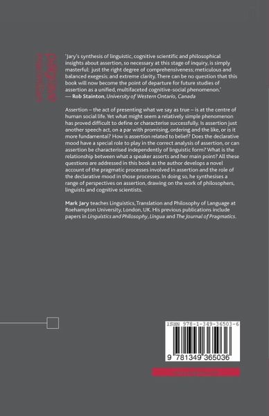 'Jary's synthesis of linguistic, cognitive scientific and philosophical insights about assertion, so necessary at this stage of inquiry, is simply masterful: just the right degree of comprehensiveness; meticulous and balanced exegesis; and extreme clarity. There can be no question that this book will now become the point of departure for future studies of assertion as a unified, multifaceted cognitive-social phenomenon.' Rob Stainton, University of Western Ontario, Canada
