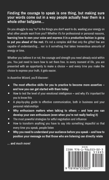 Finding the courage to speak is one thing, but making sure your words come out in a way people actually hear them is a whole other ballgame... Do you struggle to say "no" to the things you don't want to do, wasting your energy on what other people want from you? Maybe this is a problem for you at work and, as a result, you keep missing out on opportunities? Or perhaps it plays out in your romantic relationships, leaving you feeling undervalued and unrecognized simply because you don't know how to express your desires? If you're feeling down and lacking confidence but don't know what to do about it, then you've come to the right place! Whether it's for professional or personal reasons, learning how to own your voice and express it in a productive fashion is going to put you ahead of the rest. It's not a complex skill that only the gifted few are capable of understanding... nor is it something that takes tremendous amounts of energy or time. Whether you believe it or not, the courage and strength you need already exist within you. You just need to learn how to set them free. In every moment of life, you are presented with an opportunity to make a choice -- and every time you make the choice to express your truth, it gets easier. Getting started is simply a matter of knowing what to do. With this new insight into how you can effectively get your message across -- without scaring others off or showing them how nervous you truly are -- you'll soon find the things you want most in life are just around the corner, ready and waiting for you. In Assertive Wizard, you'll discover: ¿ The most effective skills for you to practice to become more assertive -- and how you can get started with them today ¿ How to test the level of your emotional intelligence -- and why it's important for you to know this ¿ A play-by-play guide to effective communication, both in business and your personal relationships ¿ Why enthusiasm matters when talking to others -- and how you can develop your own enthusiasm (even when you're not really feeling it) ¿ The most powerful strategies for artful negotiation and influence ¿ How to transform anything you have to say into something impactful so that every time you speak, people listen ¿ Why you need to understand your audience before you speak -- and how to position your message so that those who are listening can directly relate ... and much more! There's no magic involved -- those who are great at public speaking don't have something you don't. They're just paying attention to different aspects of the situation and giving their focus to more productive tasks. All you have to do to completely transform your outlook is to begin embodying the same approach. Stop wishing for things to get easier with time -- it's time to make a change now!