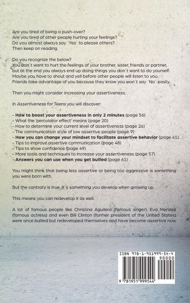 Tired of being a push-over? Do you have enough of your feelings getting hurt by other people? Do you have a hard time to say: No? Then keep reading... You don¿t want to hurt the feelings of other people, so in the end you agree and end up doing things you don't like. When you try to express your opinion, others ignore you. Friends take advantage of you because they know you won¿t say ¿Nö easily. Do you recognize this? Then raising your assertiveness will improve your life on many fronts. Here's just a tiny fraction of what you'll discover in Assertiveness for Teens:How to boost your assertiveness in only 2 minutes (page 56) What the 'percolator effect' means (page 20) How to determine your current level of assertiveness (page 26) The communication style of low assertive people (page 9) How you can change your mindset to facilitate assertive behavior (page 41) Tips to improve assertive communication (page 48) Tips to show confidence (page 49) More tools and techniques to increase your assertiveness (page 57) Answers you can use when you get bullied (page 61) You might think that being less assertive or being too aggressive is something you were born with. But the contrary is true, it¿s something you develop when growing up. This means you can redevelop it as well. A lot of famous people like Christina Aguilera (famous singer), Eva Mendez (famous actress) and even Bill Clinton (former president of the United States) were once bullied. They have redeveloped themselves and you can see the results. So, decide it's your turn now and click ¿Add to Cart¿.