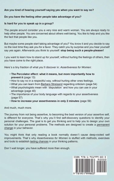 ired of hearing yourself saying yes when you want to say no? Do you have the feeling other people take advantage of you? Is it hard for you to speak up in a group? Then keep reading... The people around consider you a very nice and warm woman. You are always ready to help other people. You are concerned about others well-being. You like to help and you like the fact that people like you. But maybe some people start taking advantage of you? You know it and you decide to say no the next time they ask you for a favor. They catch you by surprise and you hear yourself say yes again. Afterward you think to yourself: stop being such a people-pleaser! I you want to learn how to stand up for yourself, without hurting the feelings of others, then you have come to the right place. Here¿s a tiny fraction of what yoüll discover in Assertiveness for Women:The Percolator effect: what it means, but more importantly how to prevent it (page 13) How to say no in a respectful way, without hurting other one's feelings. What you can learn from Barbara Streisand regarding criticism (page 54) What psychologists mean with ¿disputation¿ and how you can use in your advantage (page 40) The importance of your body language with regards to your assertiveness How to increase your assertiveness in only 2 minutes (page 59) And much, much more. The journey from not being assertive, to becoming the best version of your assertive self, is different for everyone. That¿s why yoüll find self-discovery questions to identify your personal challenges. The goal is to get you thinking and to help you to design your own solution for your personal problems. The methods are designed to create a permanent change in your behavior. You might think that only reading a book normally doesn¿t cause deep-rooted self-improvements. That¿s why Assertiveness for Women is stuffed with methods, exercises and tools to establish lasting changes in your thinking patterns. Don¿t wait longer, you have suffered more than enough. Scroll up and click: ¿Add to Cart¿.