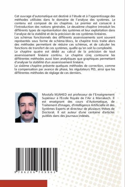 Cet ouvrage d'automatique est destiné à l'étude et à l'apprentissage des méthodes utilisées dans le domaine de l'analyse des systèmes. Le contenu est composé de six chapitres. Le premier est consacré à l'introduction des notions générales. Le deuxième chapitre introduit les différents types de représentation des systèmes et leur exploitation dans l'analyse de la stabilité et de la précision de ces systèmes linéaires.Les schémas fonctionnels des différents asservissements sont souvent représentés sous forme de schéma-blocs, le chapitre trois traite alors des méthodes permettant de réduire ces schémas, et de calculer les fonctions de transfert de ces systèmes, quelle qu'en soit la complexité.Le chapitre quatre est dédié au calcul de la précision de tout asservissement linéaire continu. Le chapitre cinq contourne les différentes méthodes aussi bien analytiques que graphiques permettant d'analyser la stabilité d'un asservissement linéaire. Le sixième chapitre présente quelques méthodes de correction, comme la compensation par avance de phase, les régulateurs PID, ainsi que les différentes méthodes de réglage de ces derniers.