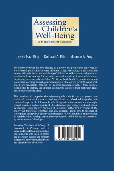Behavioral medicine has now matured as a field to the point where all recognize that different populations are presented with different issues. Psychological reactions and patterns affect the health and well-being of children, as well as adults, and numerous standardized instruments for the assessment of a variety of areas of children's functioning are currently available. Yet, it can be difficult for practitioners and researchers searching through general compendia of resources for child assessment--which are frequently focused on general techniques rather than specific instruments--to identify the optimal ones to meet their particular needs and to choose among them. This practical and comprehensive reference guide is the first to sort, present, and review all the measures that can be used to evaluate the behavioral, cognitive, and emotional aspects of children's health. It organizes the measures under eight general headings, such as quality of life, adherence, pain management, and patient satisfaction. Each chapter begins with a leading authority's overview of the underlying theoretical construct and any concerns about how to measure it. Descriptions and reviews of relevant instruments follow; these include information on administration, scoring, psychometric properties, and ordering, as well as comments by the instruments' developers. Assessing Children's Well-Being: A Handbook of Measures will be welcomed by all those professionals and scientists who seek to assess and effectively address the complex interactions between physical health and mental health in children.